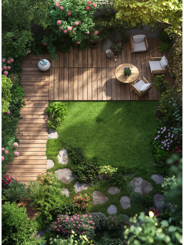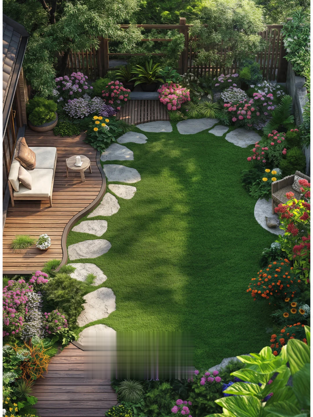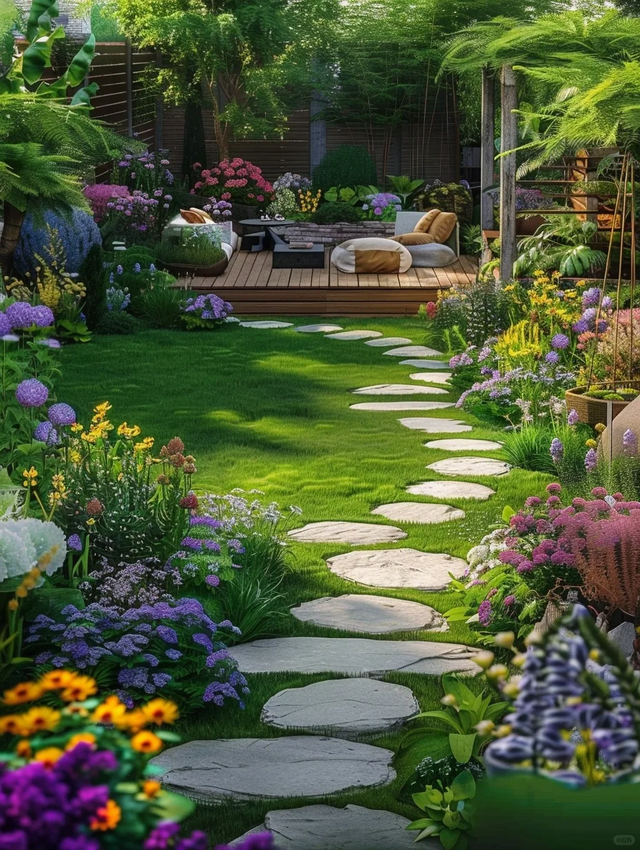 绿色的草坪、彩色的花朵、灰色的石头、棕色的木椅,这些色彩和质感被巧妙地融合在一起,既突出了各自的特点,又保持了整体的和谐统一。